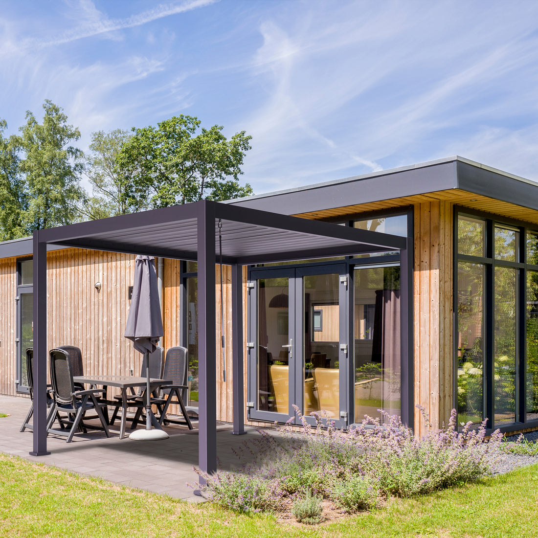 The standout feature of this pergola is the independent adjustable louvered roof. The angle of each roof panel can be adjusted from 0 to 90 degrees using a hand controller, allowing you to control sun and shade throughout the day. This flexibility sets the Domi pergola apart from fixed roof options.